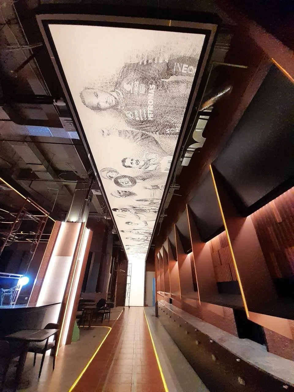 Hành lang hiện đại với trần căng in họa tiết chân dung nghệ thuật và hệ thống đèn chiếu sáng ấm.